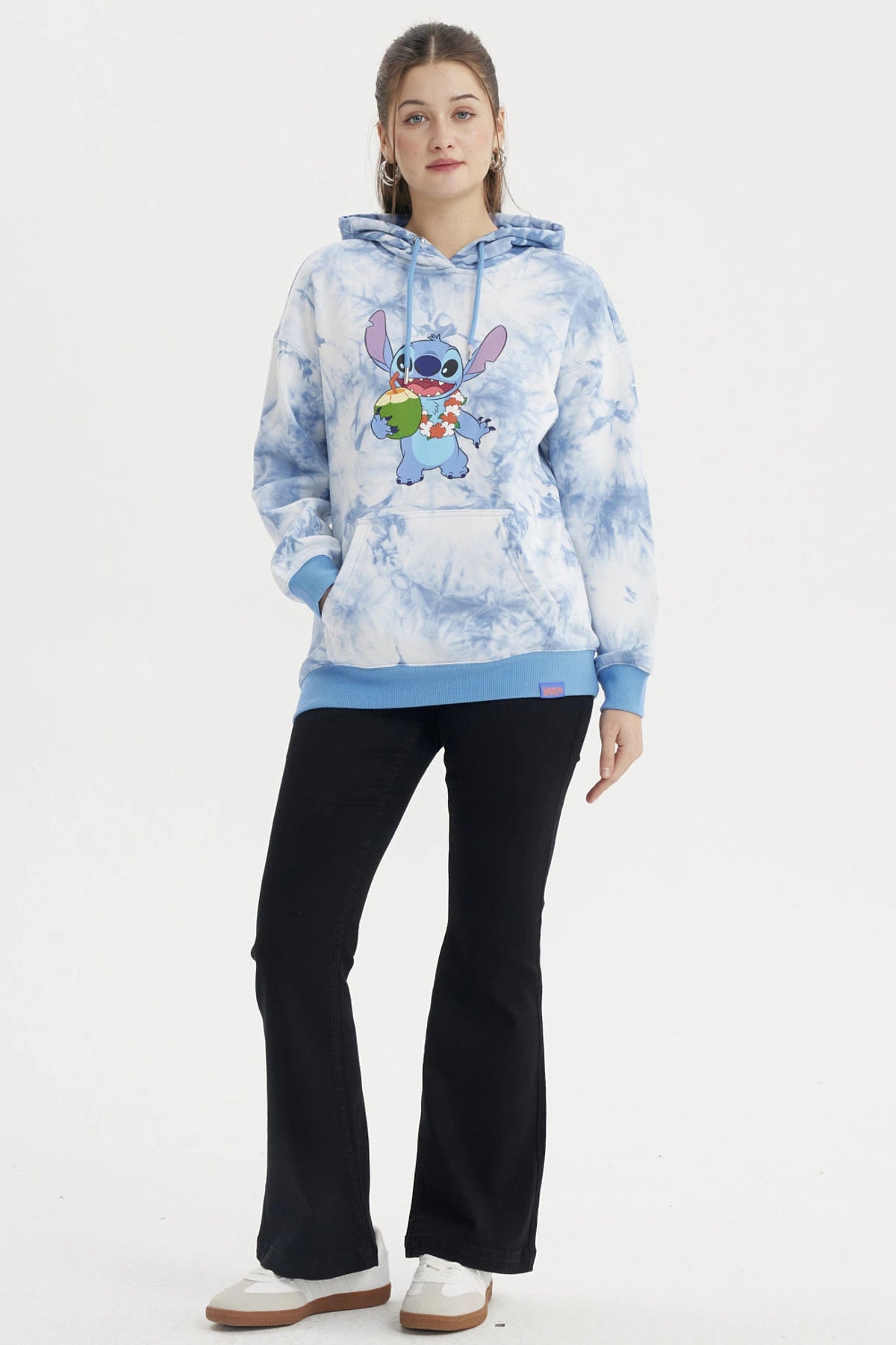 ¡Lleva la vibra tropical y divertida de Stitch a tu look! Este polerón blanco con efecto tie-dye azul es ideal para quienes aman la energía única del experimento 626. Con capucha ajustable y bolsillo canguro, destaca por su diseño alegre donde Stitch aparece disfrutando una bebida refrescante con collar de flores.
